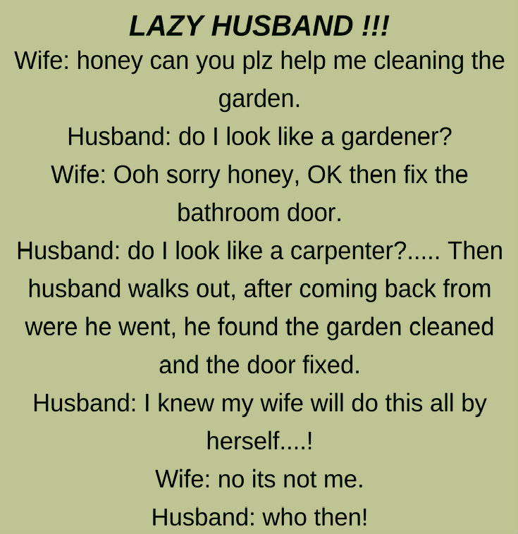 Wife: honey can you plz help me cleaning the garden. Husband: do I look like a gardener? Wife: Ooh sorry honey, OK then fix the bathroom door. Husband:...