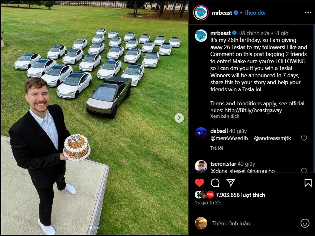 Celebrating his birthday, the world-famous YouTuber gives away free Tesla electric cars to viewers