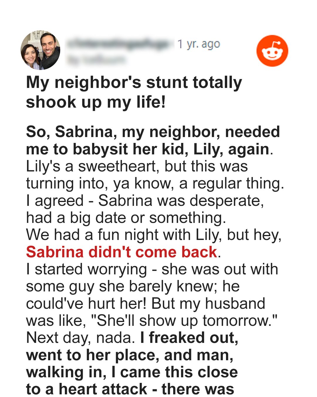 Sabrina, a single mother and neighbor, entrusted her daughter Lily to Erica and Arnold’s care for a night, but she vanished, leaving the couple to raise the child....