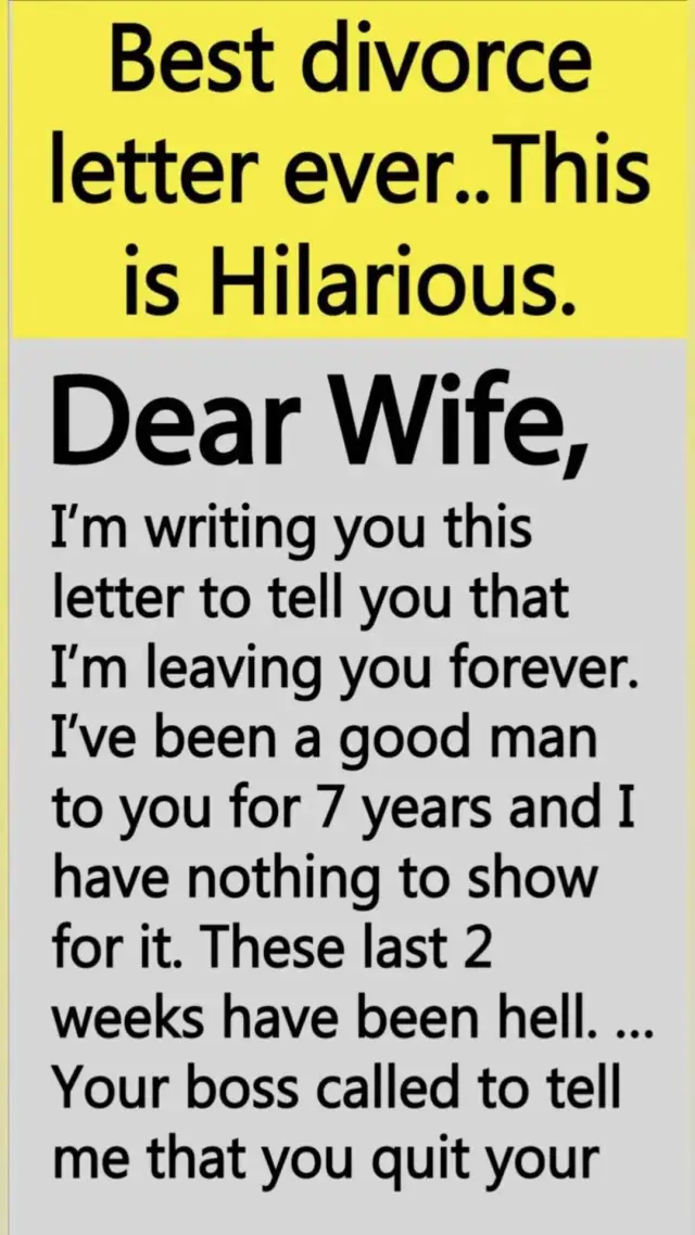 BEST DIVORCE LETTER EVER Dear Wife, I’m writing you this letter to tell you that I’m leaving you forever. I’ve been a good man to you for 7...
