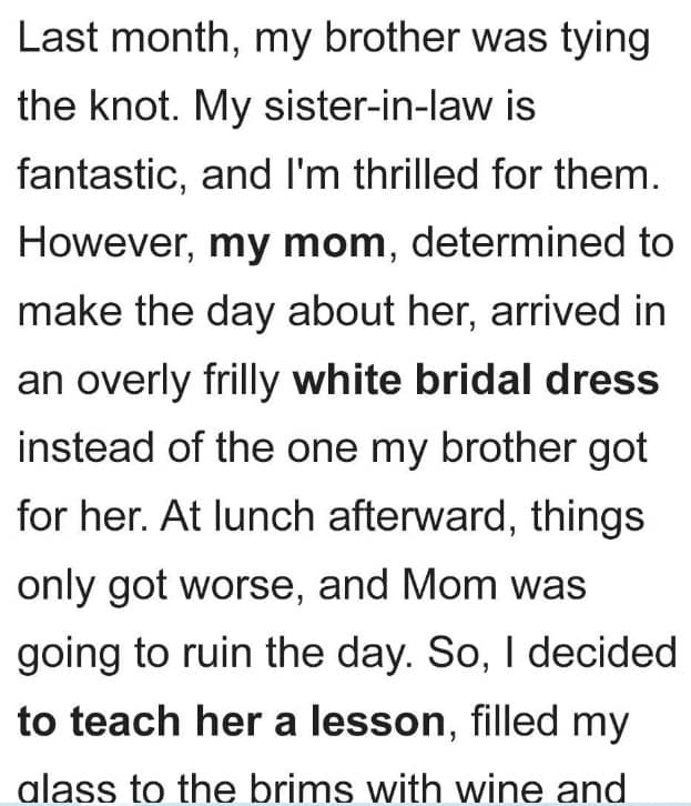 At his brother’s wedding, a man decided to give his mother a taste of her own medicine. He shared the story on Reddit, where he was praised for...