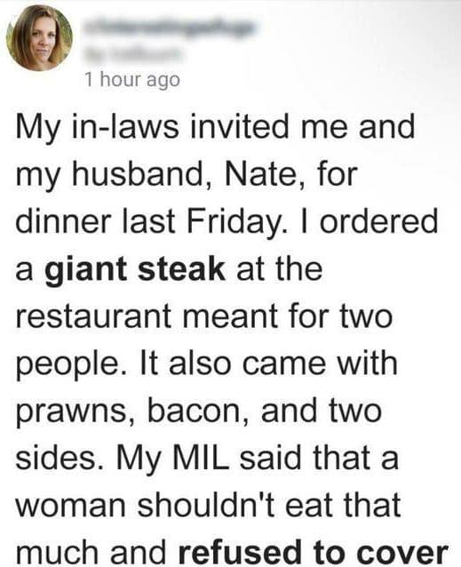 A woman’s family dinner turned into an uncomfortable situation when her mother-in-law criticized her eating habits. The woman, known for her slim figure, shared her story on Reddit,...